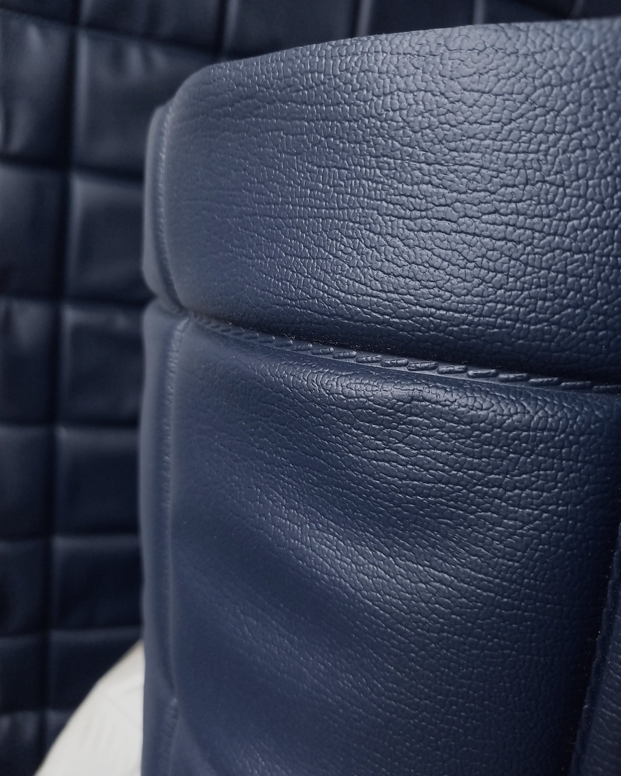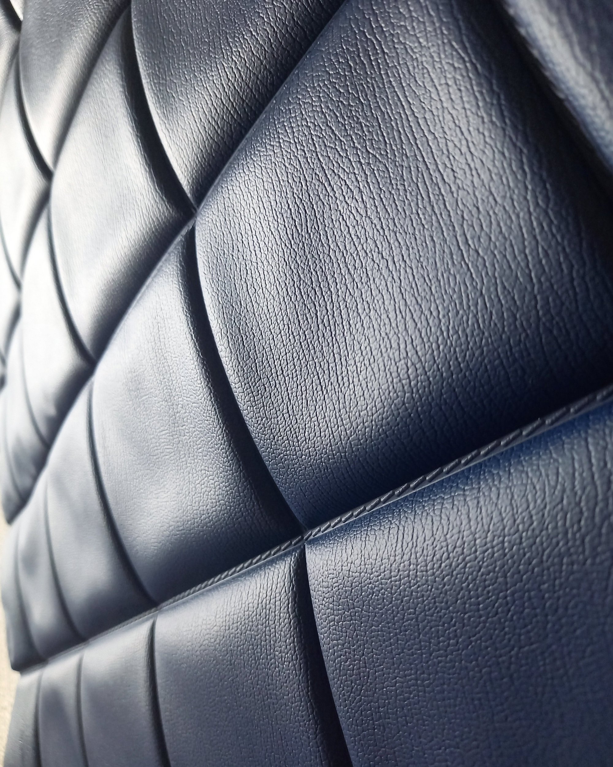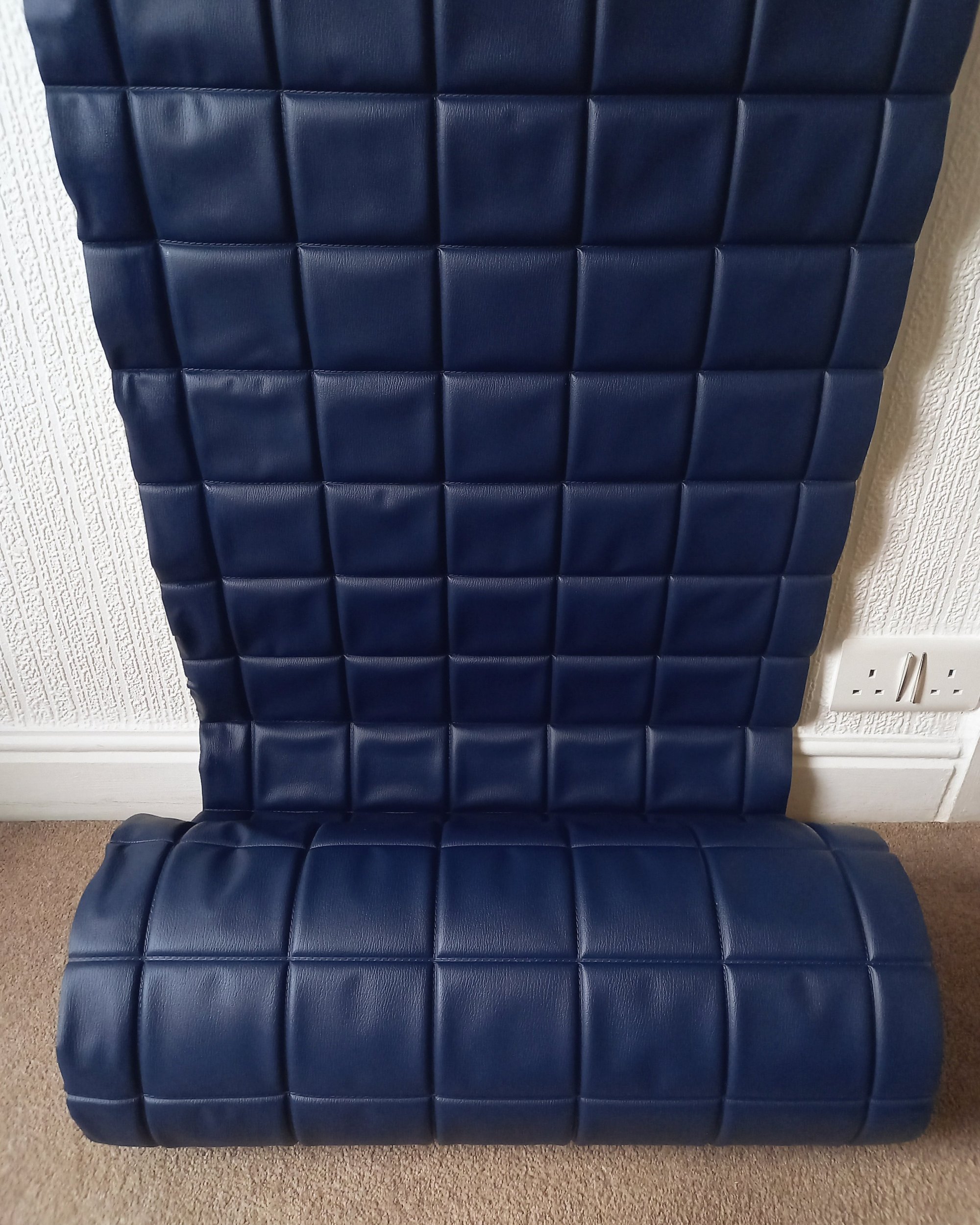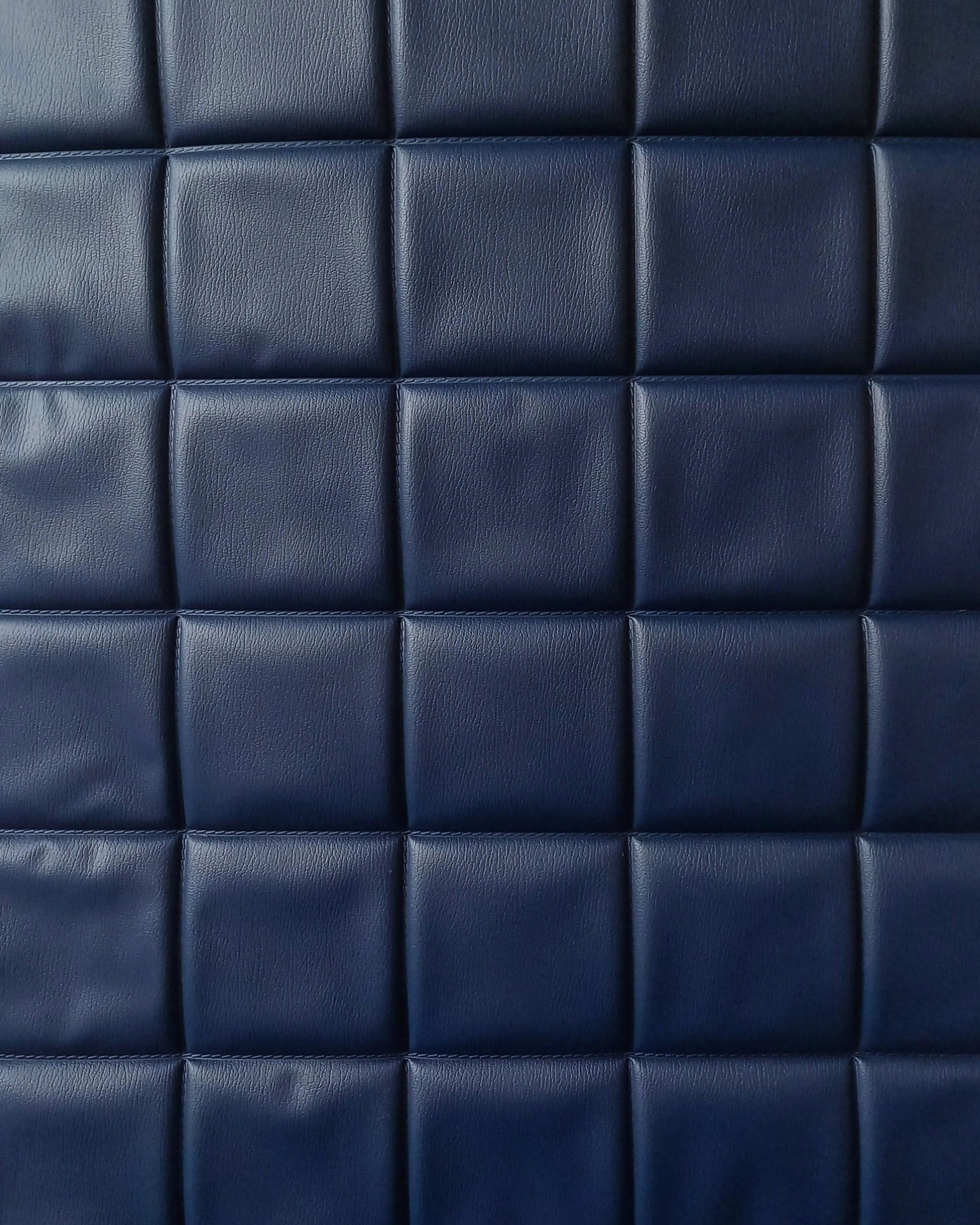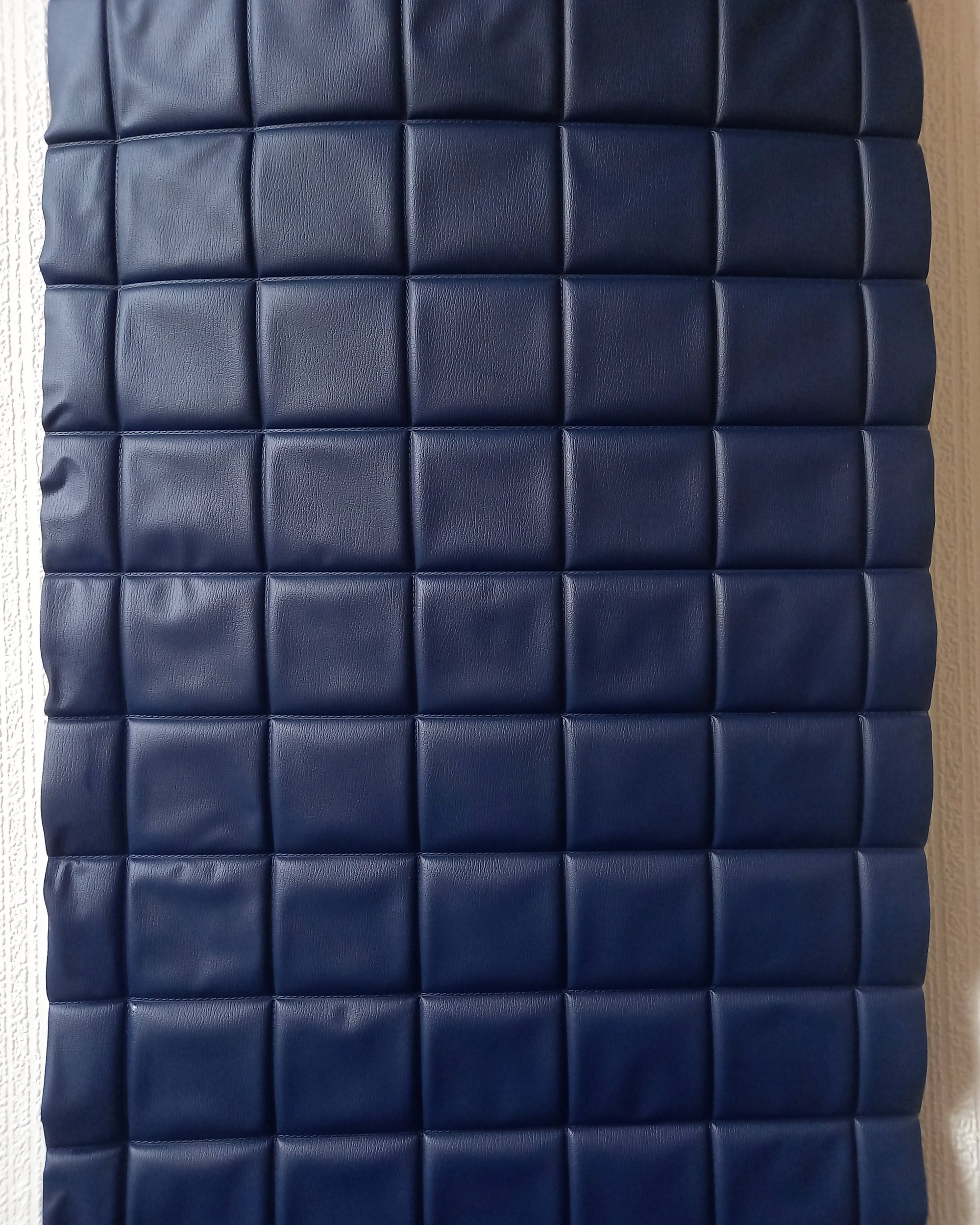 Design / Era / Style: 1960s - 1970s | Padded wallcovering | Mid-century modern | Dark navy | 'Chocolate bar' cushioning | Stitched detailing | Square structured padding | Rare item | Commercial space | Caravan interior | Bars/disco/nightclub | Quilted