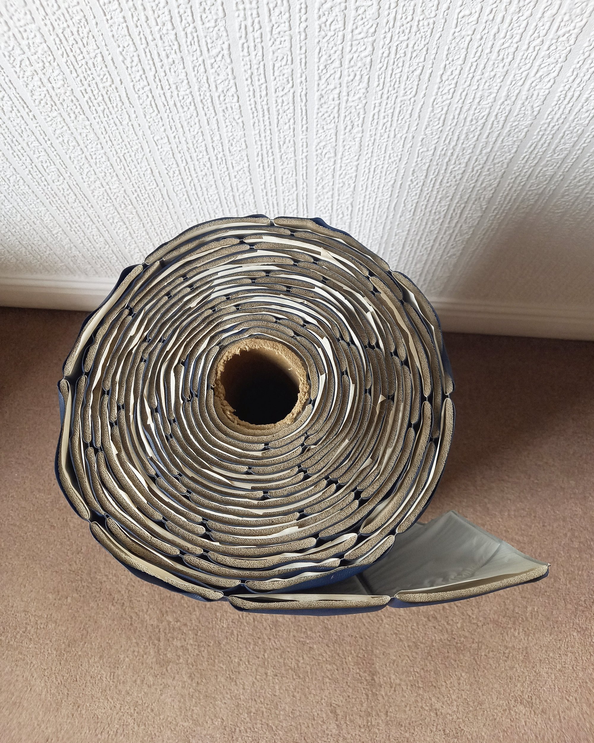 Application: The roll is heavy and will need a strong contact adhesive for fixing in place. The edges are "open" so seams should be hidden behind trims, aluminium channels, wooden battens or tucked into corners. It's not meant for edge to edge pattern‑matching like wallpaper. It was installed like upholstery on a roll - cut into panels, coated with contact adhesive, and pressed onto walls, alcoves, or furniture.